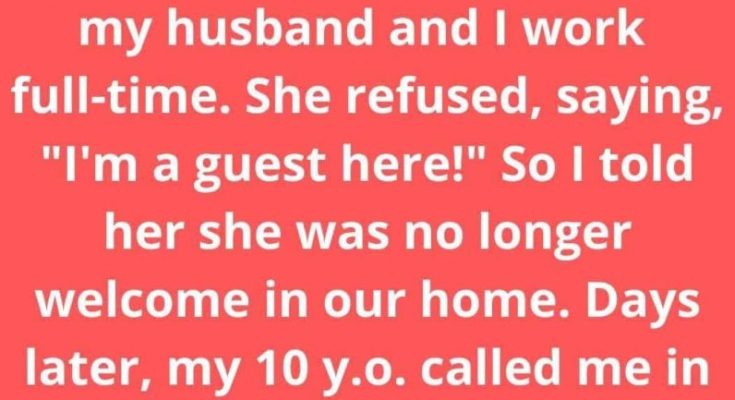 My MIL is retired and visits us a lot, often staying for the weekends. I asked her to help by cooking for the kids while my husband and I work full-time. She refused, saying, “I’m a guest here!” Frustrated, I told her she was no longer welcome in our home. Days later, my 10 y.o. called me in tears.