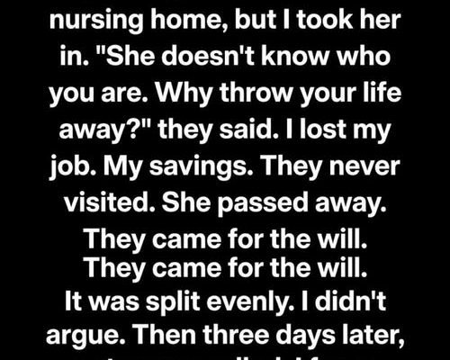 Afterward, my siblings returned to handle practical matters. Papers were signed. Plans were discussed. Everything was divided evenly, just as my mother had arranged long before her memory began to falter.