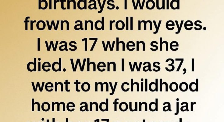 While sorting through old boxes, I stumbled across a small glass jar labeled “For You.” Inside were the 17 postcards my grandma had given me. I smiled nostalgically, but when I turned over the first card, my smile froze. There was a handwritten note on the back — and it wasn’t just a birthday message. It was a clue. One by one, I flipped through the postcards, each revealing part of a hidden story.