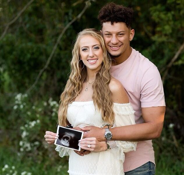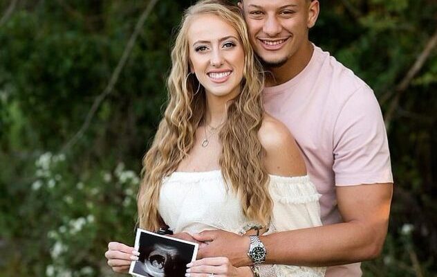 Photos accompanying the post showed Patrick and Brittany surrounded by their three children, all dressed in matching red Chiefs jerseys, holding up a tiny baby onesie that read “Future MVP.”