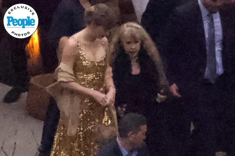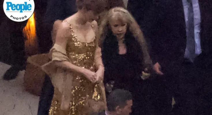 Swift, who got engaged to Travis Kelce in August, wore a regal metallic gown to her close friend’s wedding in Ojai, Calif.