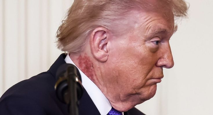 In addition to the rash spotted on his neck, Trump’s right hand was also seen sporting the same bruise it had for months, once again covered by a layer of makeup.