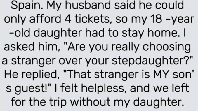 My 16 y.o. stepson wants to invite his new girlfriend on our trip to Spain. My husband agreed but said he can’t afford more than 4 tickets, so we have to leave my 18 y.o. daughter at home. I was furious and blamed him for choosing a stranger over his own stepdaughter whom he’d been raising since she was 7. He replied,