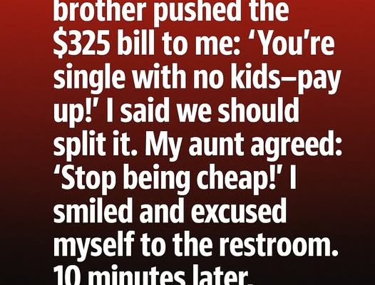Dinner had started off light and cheerful—jokes flying, glasses clinking, the kind of laughter that fills a restaurant and makes time feel unimportant. But when the check arrived, the mood shifted. My brother slid the $325 bill toward me with a grin. “You’re single with no kids—come on, you can cover it,” he said, as if it were the most natural thing in the world. My aunt added, half-joking, “Don’t be cheap!” and a few others laughed. I smiled, not because it was funny, but because something clicked.