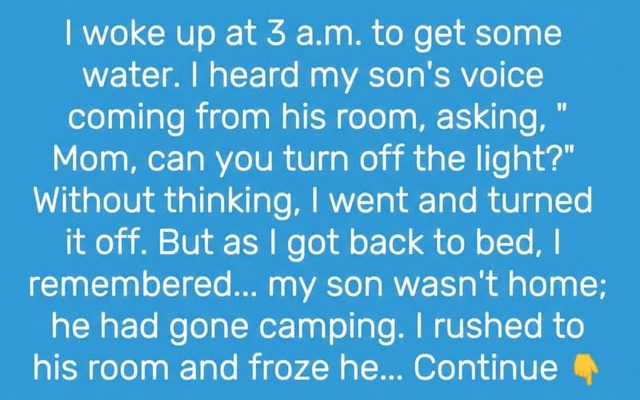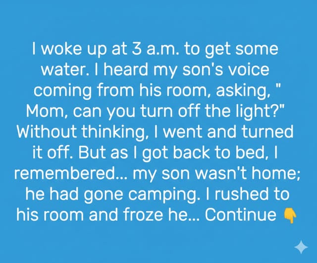 I woke up at 3 a.m., thirsty and groggy, the house wrapped in deep silence. As I walked to the kitchen for water, I heard my son’s voice calling from his room, asking me to turn off the light. It sounded completely natural, the kind of request I had heard countless times before. Without thinking, I moved down the hallway, switched off the lamp, and returned to bed.