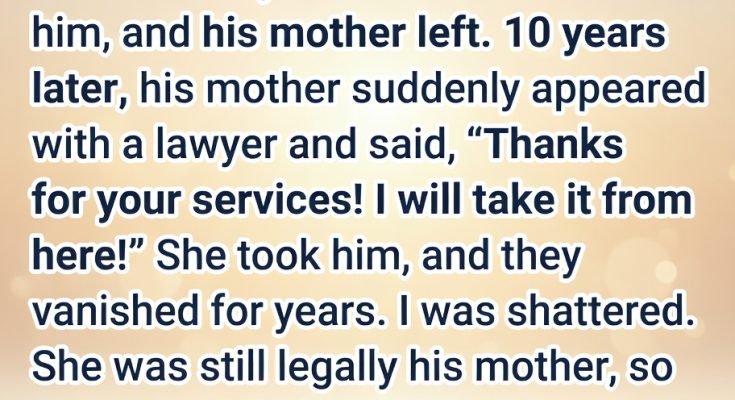 Then, when he was twelve, everything collapsed. His mother suddenly reappeared, dressed in polished confidence and standing at my door with a lawyer at her side. She didn’t even look at her own son when she said she was taking him back. The words were cold, final, and legal—and they left me powerless. I watched as he was put into a car, his face pressed against the window, crying for me while I stood frozen, unable to stop any of it.