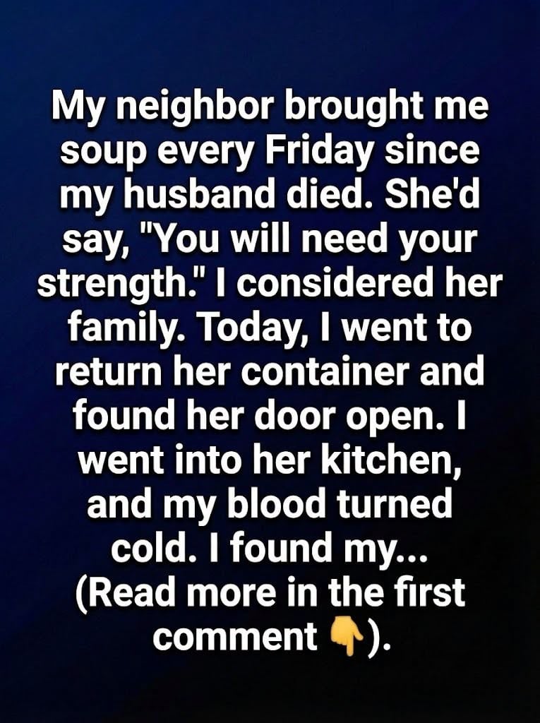 I didn’t understand, at first, what she was really offering. A bowl of soup on Fridays seemed small against the vastness of death. Yet her timing, her steadiness, and her refusal to demand conversation slowly rewired the shape of my days. Her soups became markers of time, of survival: another week endured, another breath taken, another night faced and somehow passed through. They were proof that someone was quietly keeping watch while I relearned how to exist.