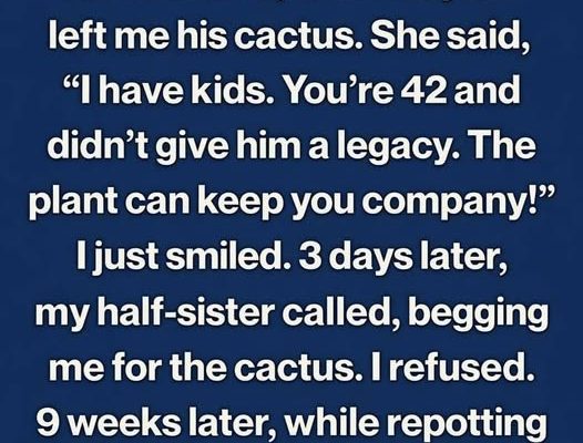 She took the cactus home without protest, feeling the weight of everyone’s assumptions pressing harder than the clay pot in her hands. It was easy to see it as a joke, a consolation prize for the daughter without a family of her own, the one who could “make do” with something symbolic. Yet in the quiet of her kitchen, that small, stubborn plant began to feel less like an insult and more like a final, unfinished sentence from a man who had never been good with words.